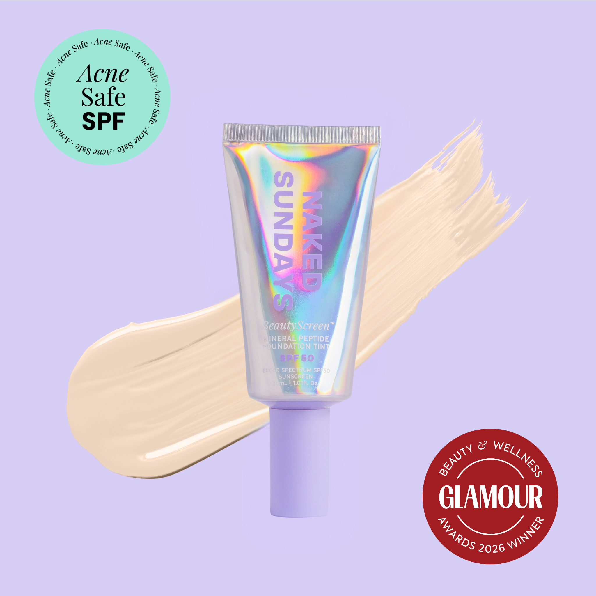 Naked Sundays Beauty sunscreen tube with a swatch on a purple background, featuring 'Acne Safe SPF' and 'Glamour Beauty & Wellness Awards 2026 Winner' badges.