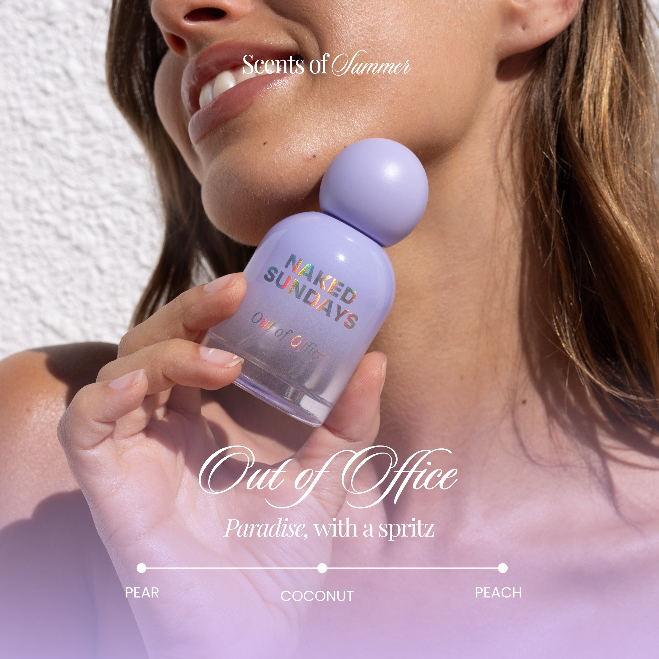The scent of that OOO auto-reply. It opens with crisp pear and juicy peach, like the first sip of a frozen cocktail. A creamy heart of coconut and fig melts into sun-warmed skin, while soft vanilla and sandalwood linger like golden hour. Flirty, sunkissed and effortlessly cool, this is Summer deliciously bottled.