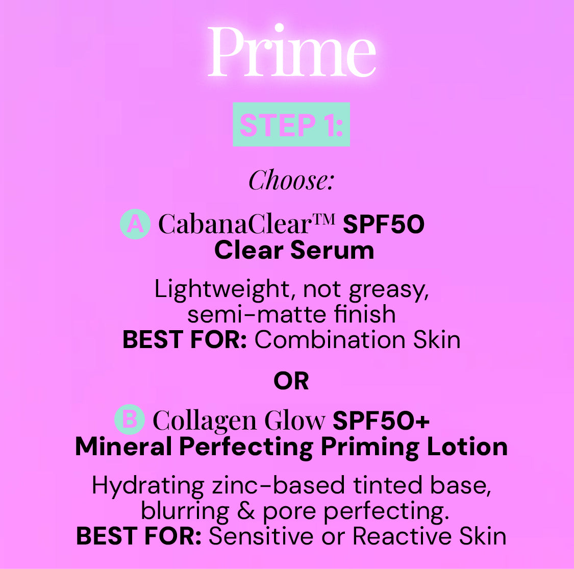 STEP 1: Choose between the CabanaClear SPF50 Water Serum 30ml OR the SPF50+ Mineral Perfecting Priming Lotion 50ml as your Primer.